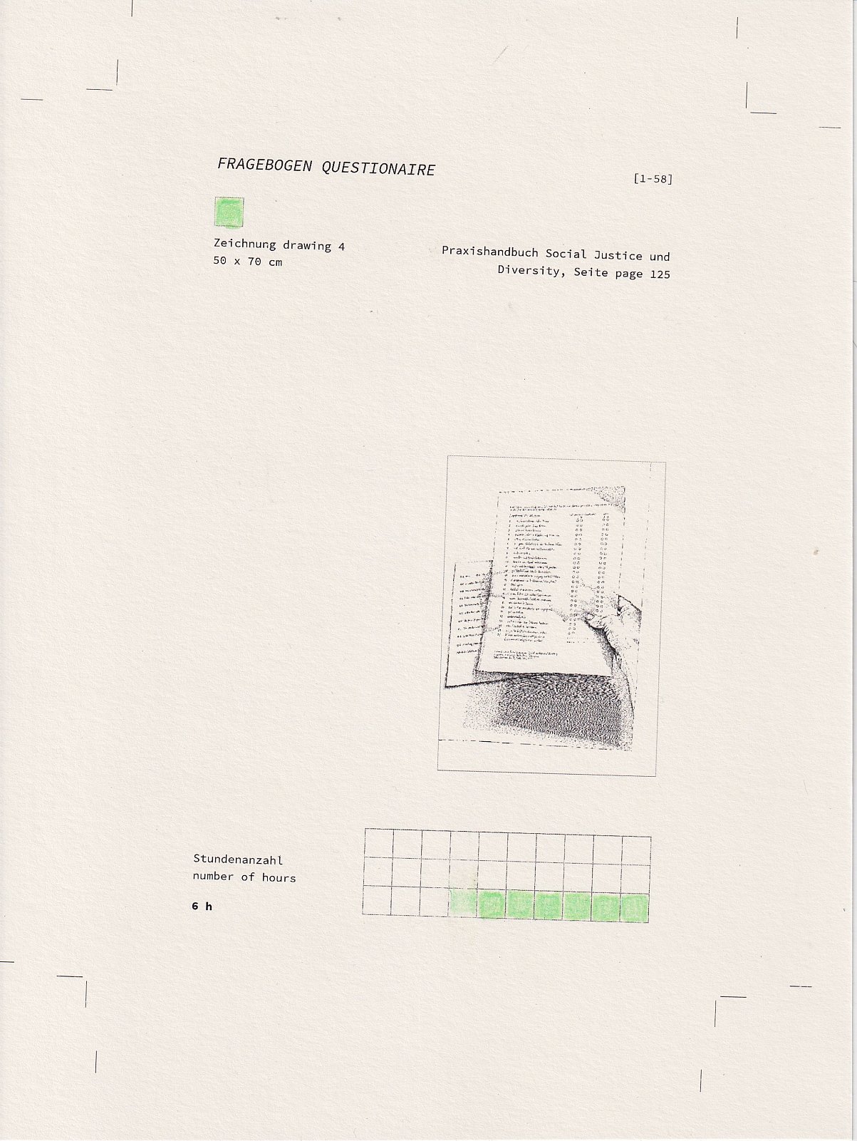With the drawings HARD WORK, I explore different processes of artistic work itself. The starting point was my video WORK BY THE PIECE, in which I asked about my mother's body movements during her many years of factory work. How can piecework wage labor—visible in the physical memory of her hands—be contrasted with my creative work? I address this issue with the working time protocol, which—similar to time cards—records the necessary tasks and working hours required for the drawings. This ialso refers to the title HARD WORK, which humorously and realistically links wage labor and artistic work. The individual sheets refer to texts, images, and songs that deal with classism that are important references in my artistic practice. For example, the title “Distinction” refers to Pierre Bourdieu, “If You Want My Future, Forget My Past” quotes a line from a Spice Girls song, and “Working Class Daughter (refuse to surrender)” refers to the book of the same german title, as well as to my own family history. The cycle of works questions the visibility of work, but at the same time refers to the (in)comparability of different work systems.