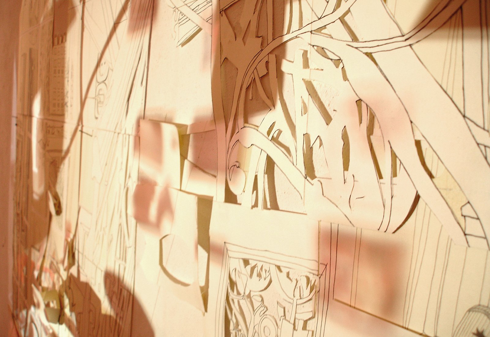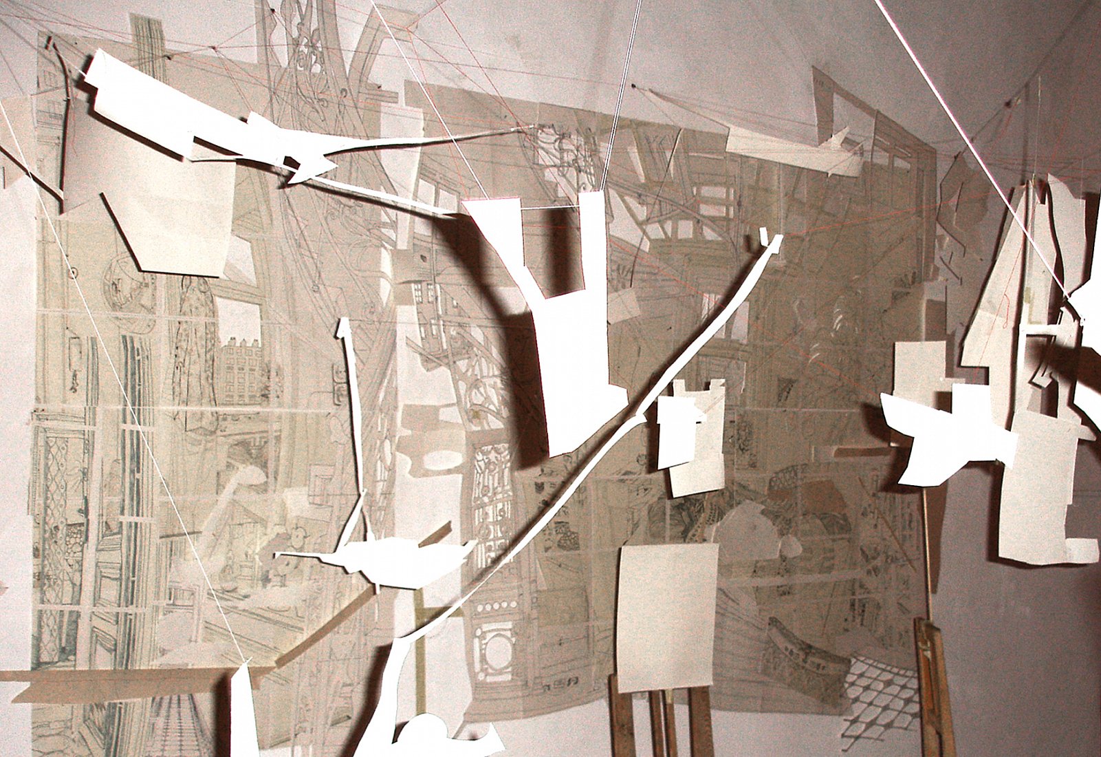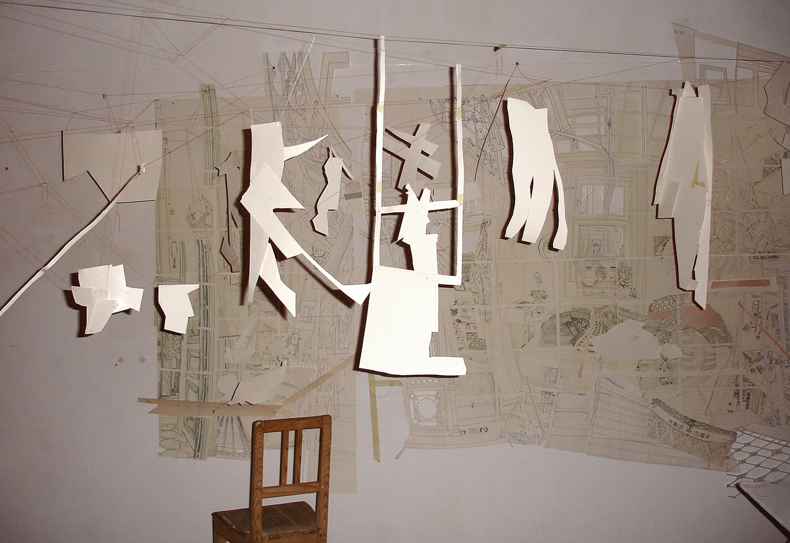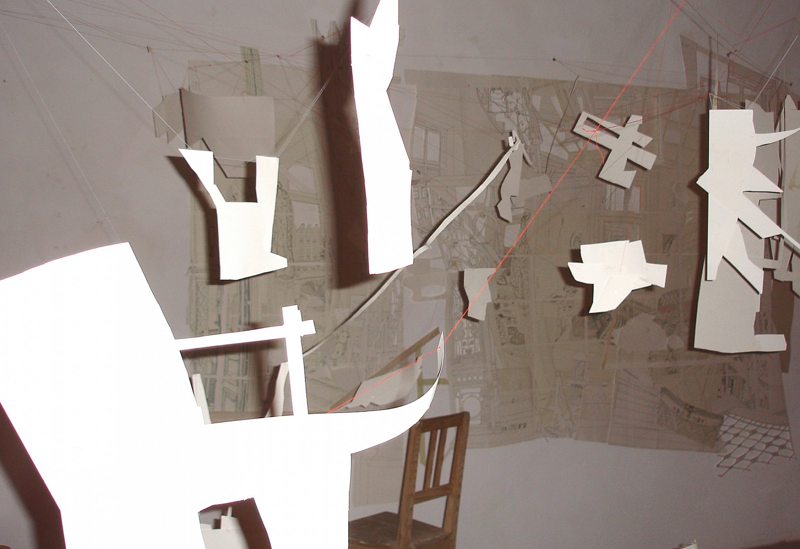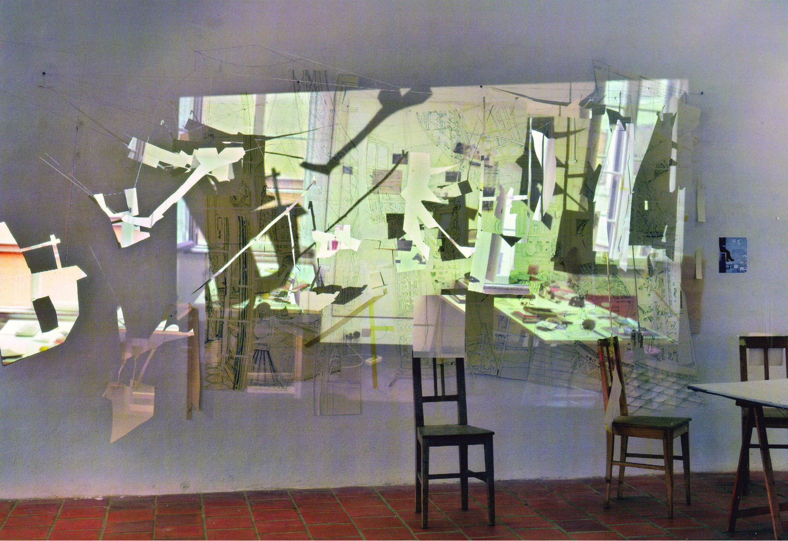 Zeichnung, Papierschnipsel im Raum, Diaprojektion, Schattenarbeit, Sessel, Tisch, Fotografie