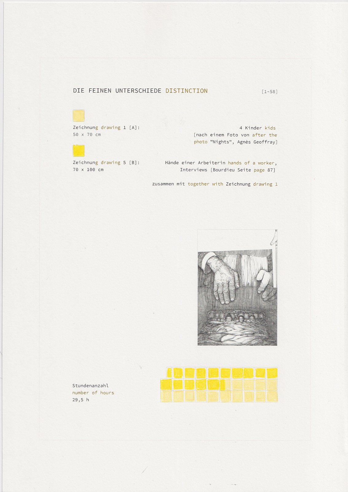 Ausgangspunkt war mein Video IM AKKORD, in dem ich nach den Körperbewegungen meiner Mutter während ihrer 15-jährigen Fabriksarbeit gefragt habe und danach, wie sich diese Bewe-gungen der maschinellen Arbeit in ihren Körper eingeschrieben haben. Ich suche nach Entsprechungen und frage nach einer Darstellbarkeit beider Systeme: Wie lässt sich die im Akkord ver-richtete Lohnarbeit meiner Mutter, sichtbar durch die Körpererinnerung ihrer Hände, meiner kreativen Arbeit gegen-überstellen, in der sich Entscheidungen über Form und Darstellung manifestieren? Darauf bezieht sich auch der Titel SCHWERE ARBEIT, der zugleich humoristisch und realistisch die Lohn- und künstlerische Arbeit eng führt. Die einzelnen Zeichnungen nehmen Bezug auf Texte und Popsongs, die sich mit der Klassenthematik auseinandersetzen und wichtige Referenzen in meiner künstlerischen Praxis sind. So verweist der Titel "Die feinen Unterschiede" auf Pierre Bourdieu, "If you want my future, forget my past" zitiert eine Text-zeile der Spice Girls, und "Working Class Daughter" (refuse to surrender) nimmt Bezug auf das Buch mit gleichnamigem Titel, sowie auf meine eigene Herkunftsgeschichte. Der Werkzyklus SCHWERE ARBEIT fragt nach der Sichtbarkeit von Arbeit, verweist jedoch zugleich auf die (Un)Vergleichbarkeit unterschiedlicher Arbeitssysteme.