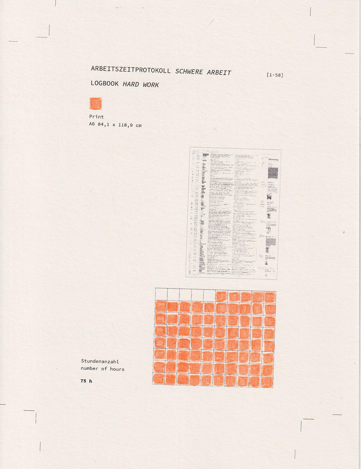 SCHWERE ARBEIT ist ein Versuch künstlerische Arbeit in Form von Datum, Dauer und Tätigkeitsfeld (Recherche, Experiment, Zeichnen, …) zu untersuchen, um zu erforschen, wie kreative Prozesse ablaufen.