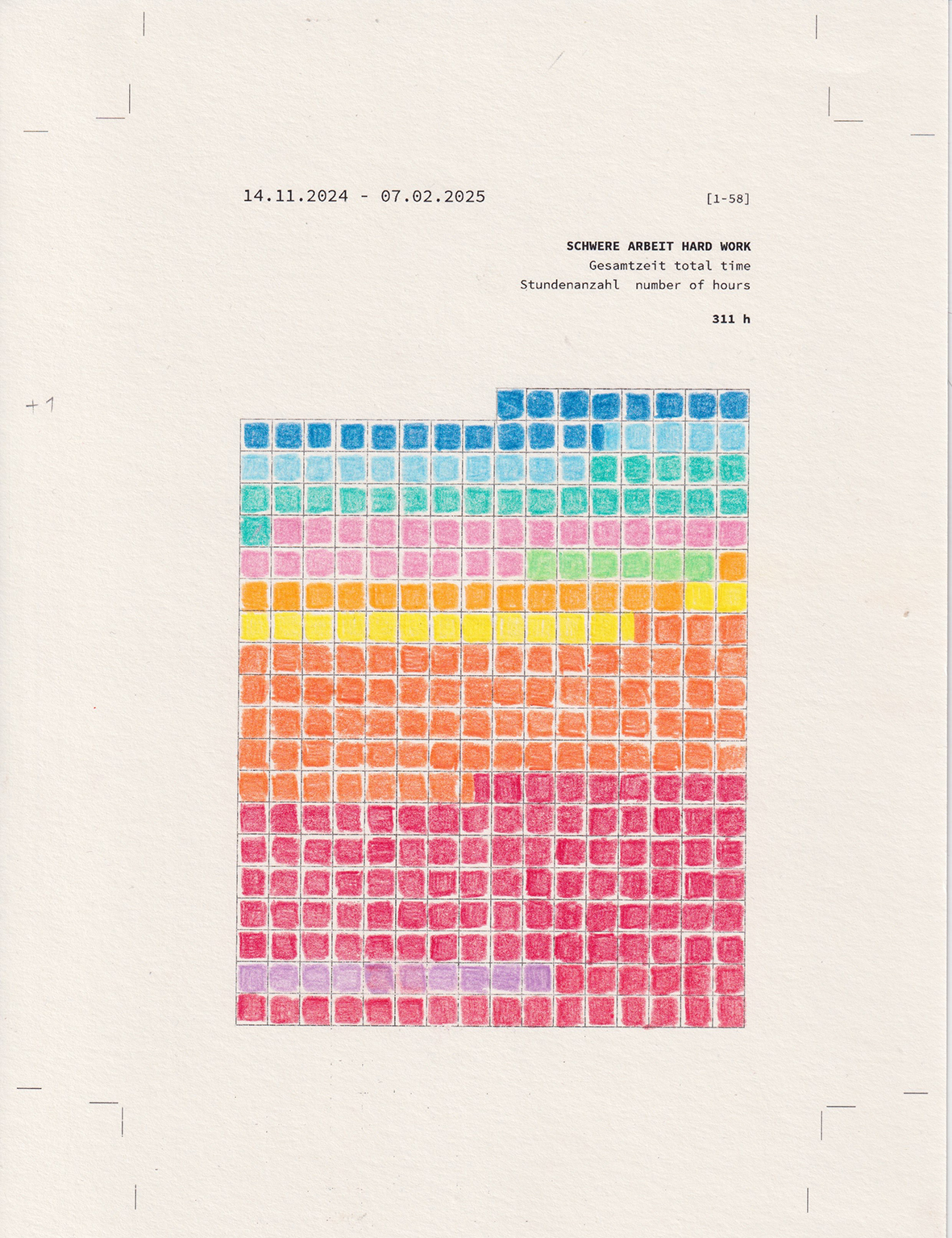 SCHWERE ARBEIT ist ein Versuch künstlerische Arbeit in Form von Datum, Dauer und Tätigkeitsfeld (Recherche, Experiment, Zeichnen, …) zu untersuchen, um zu erforschen, wie kreative Prozesse ablaufen.